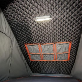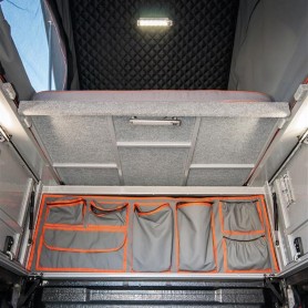 Ein spezielles MOLLE-System aus Lochplatten erlaubt die einfache Befestigung von Zubehör außen an der Heckwand. Die Stirnseite des Canopy Campers, die Hecktür, die Rückwande links und rechts der Tür und der Himmel des Dachzelts können mit Stautaschen aus strapazierfähigem Canvas-Stoff ausgerüstet werden.