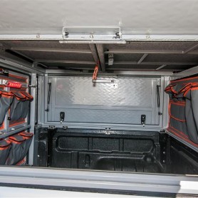 Der Rahmen um die hintere Tür ist vollständig gegen die Pickup-Ladefläche abgedichtet. Im Gegensatz zu einer normalen Heckklappe dringt so kein Staub in den Innenbereich. Die große Hecktür mit dem stabilen Haltegriff ermöglicht den einfachen Zugang in den Innenraum. Die Hecktür kann von innen und außen abgeschlossen werden und ist fähig ein Reserverad bis zu einer Größe von 33-Zoll zu tragen.